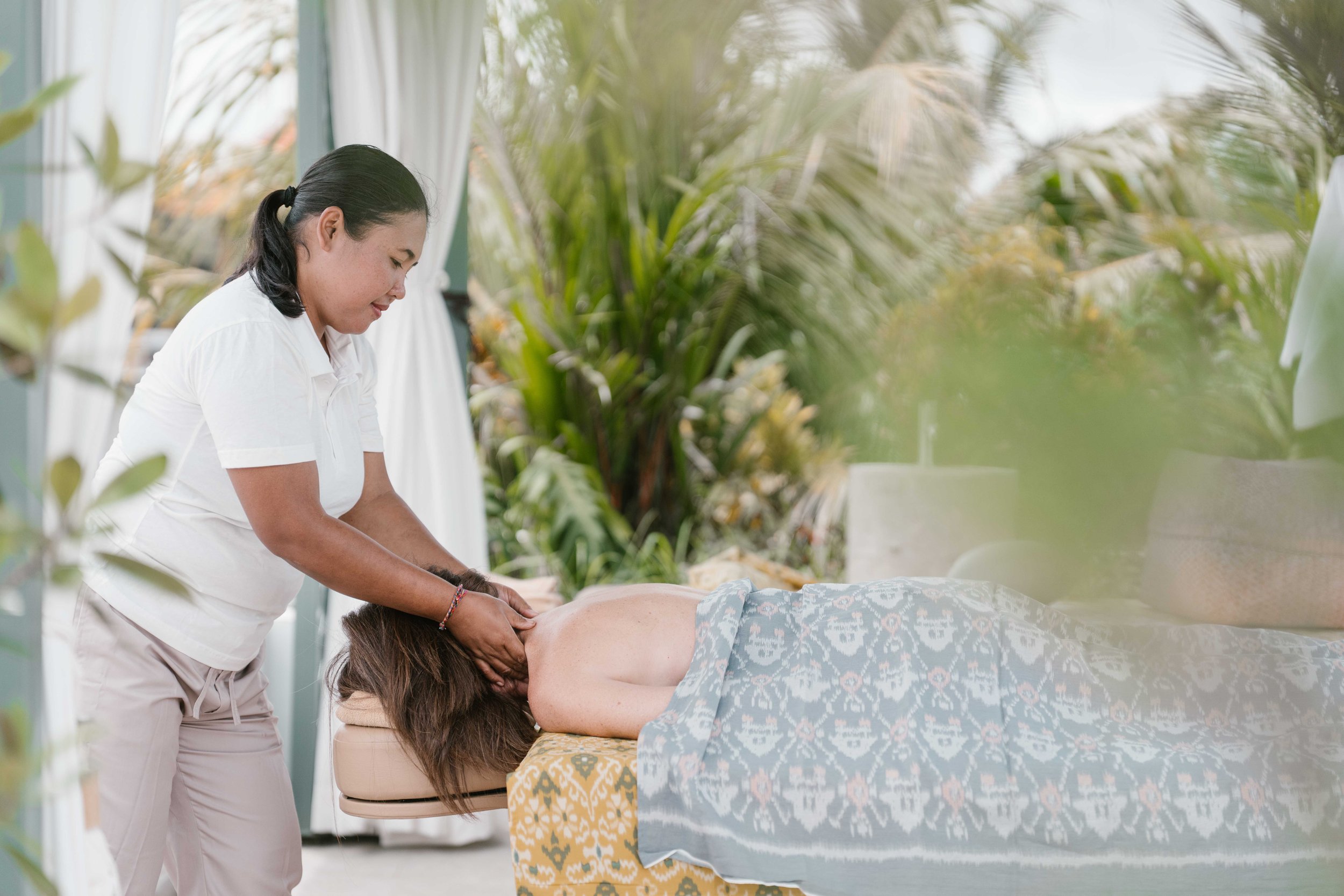 Traditional Balinese massage treatments offered in an open-air pergola designed for deep relaxation.
